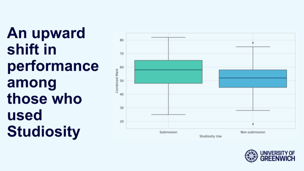 - Studiosity users average final mark was 56% compared to 53% for those who didn’t use Studiosity -clear upward shift in performance among those who used the service